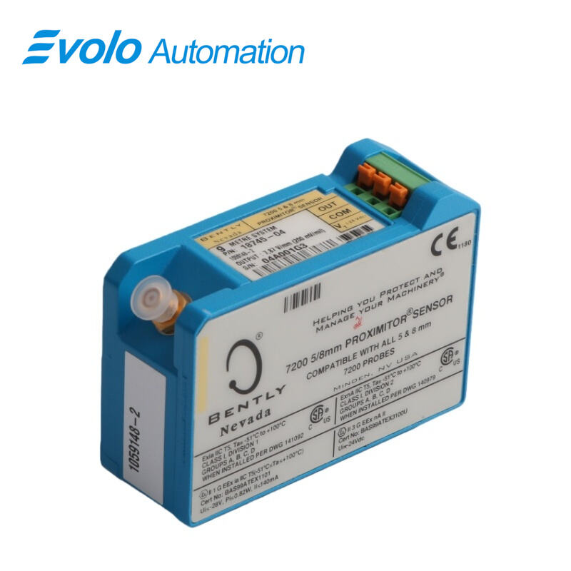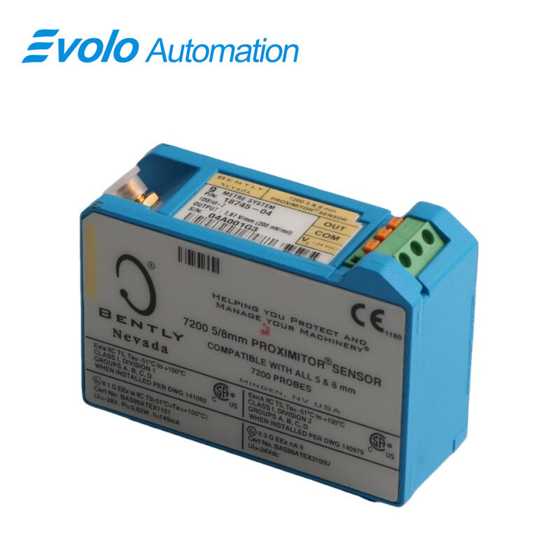 The 18745-04-05 5mm 7200 Proximitor Sensor is a high-precision noncontacting gap-to-voltage proximity sensor engineered for industrial automation, providing accurate measurement of static and dynamic displacements. With a 5 mm probe diameter and a measurement range of 0–5 mm, the sensor outputs a voltage proportional to the gap, enabling real-time monitoring of machinery position, vibration, and alignment. The sensor operates reliably across a wide temperature range from -40°C to +120°C and delivers a frequency response of 0 Hz (DC) to 10 kHz, capturing both slow and high-speed motions with exceptional fidelity. Constructed with stainless steel housing and equipped with a shielded twisted pair cable, the 7200 Proximitor Sensor ensures high durability, IP67 protection against dust and water ingress, and minimal signal interference. Adjustable sensitivity and linearity of ±1% allow for custom calibration to optimize accuracy in fluid-film bearings, turbines, motors, and other precision machinery. Optional M12 or DIN connectors facilitate seamless integration into automation, condition monitoring, and predictive maintenance systems.