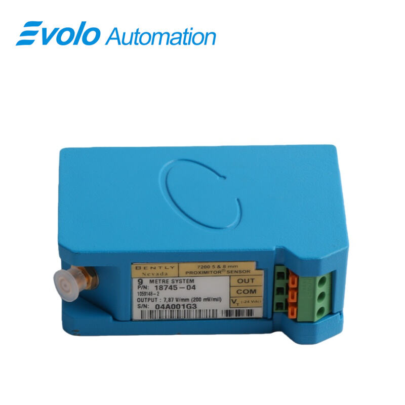 The 18745-04 sensor operates across an operating temperature range of -50°C to +100°C and voltage rating from -18 to -24 VDC, ensuring reliable performance in automated systems under harsh environmental conditions. The 18745-04 supports continuous distance measurement, providing critical data for automated control loops, Keyphasor reference, and vibration-based analytics to enhance equipment efficiency and safety.