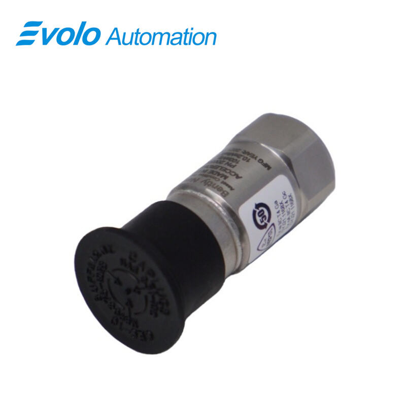 The 200350-00-00 Accelerometer is a case-mounted seismic transducer designed for industrial automation environments requiring precise vibration monitoring, trend analysis, and predictive maintenance on rotating machinery. Equipped with piezoelectric sensing technology, the 200350-00-00 Accelerometer converts dynamic acceleration forces into a proportional voltage output for integration with Trendmaster Pro systems and other industrial monitoring networks. With a sensitivity of 100 mV/g ±20%, a frequency response of 0.5 to 10,000 Hz, and a wide ±50 g measurement range, the device offers reliable performance for both low-frequency vibration trending and high-frequency fault detection. The rugged stainless-steel housing provides hermetic sealing and withstands harsh operating conditions, supporting temperatures from −54°C to +121°C and shock levels up to 5,000 g pk. Featuring a ¼–28 stainless-steel mounting stud and MIL-style connector interface, the 200350-00-00 Accelerometer simplifies field installation and replacement, making it suitable for compressors, pumps, turbines, motors, and general-purpose seismic measurements in industrial control and monitoring systems.