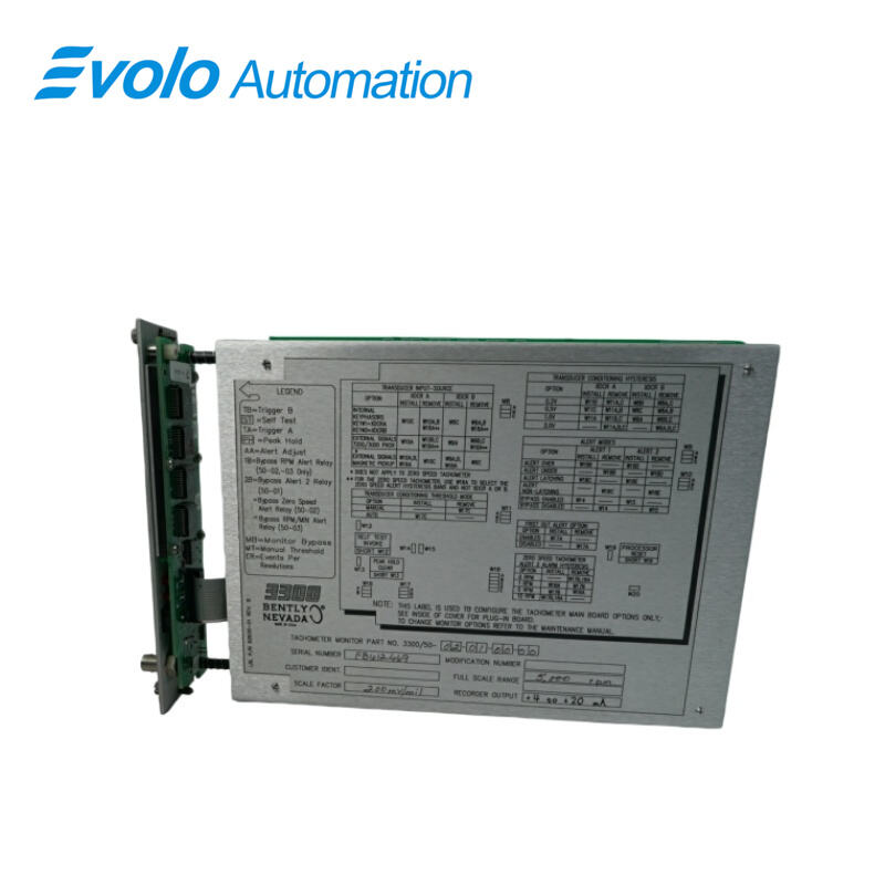 Accepting 2 transducer signals, the 3300/50-02-01-00-00 Tachometer uses internal voting logic to reduce false speed readings, enhancing reliability in automated monitoring systems.