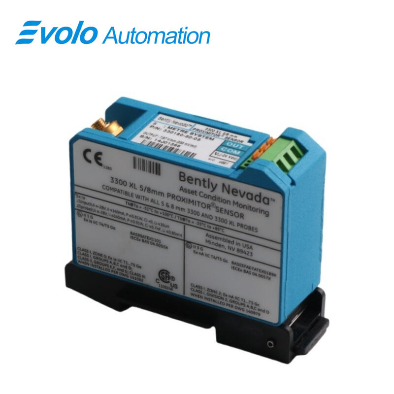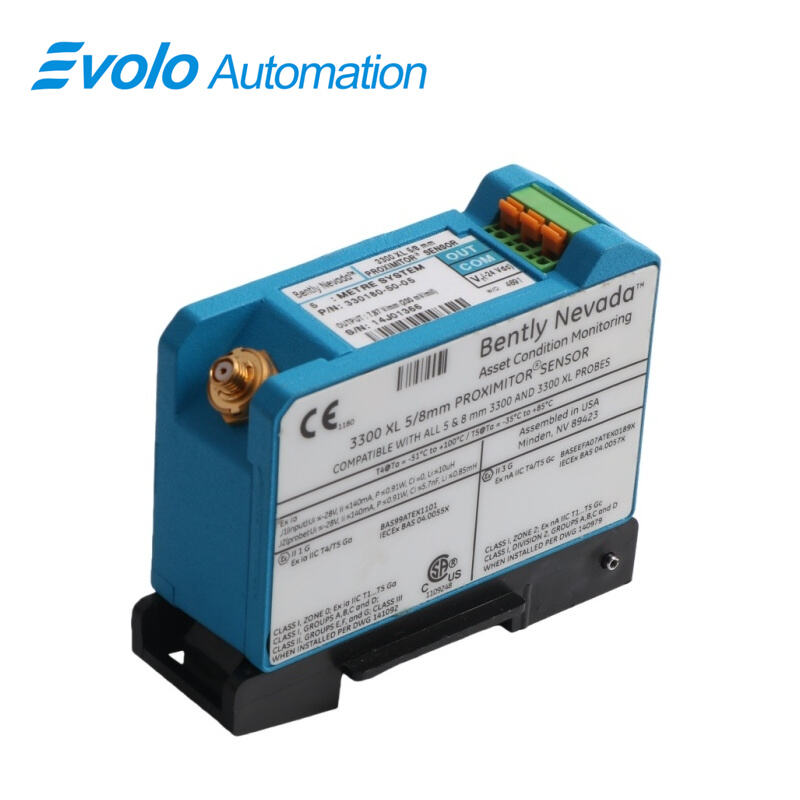 330180-50-05 3300 XL Proximitor Sensor is a high-performance signal conditioning device designed for industrial automation and machinery monitoring in fluid-film bearing machines. The 330180-50-05 accepts a single non-contacting 3300-series 5 mm or 3300 XL 8 mm Proximity Probe and extension cable, converting displacement signals into a stable voltage output for vibration, axial position, Keyphasor reference, and speed measurements. With a 5.0 meter system length, 50 Ω output resistance, supply sensitivity below 2 mV/V, and operating temperatures from -52°C to +100°C, the 330180-50-05 ensures precise signal processing even in harsh industrial environments. Constructed with A308 aluminum and carrying CSA, ATEX, and IECEx approvals, the 330180-50-05 supports long field wiring up to 305 meters with minimal signal loss and superior frequency response up to 10 kHz. Its compact panel mount design and improved RFI/EMI immunity make the 330180-50-05 ideal for high-density DIN-rail installations or traditional panels, simplifying integration into modern automated machinery control systems.