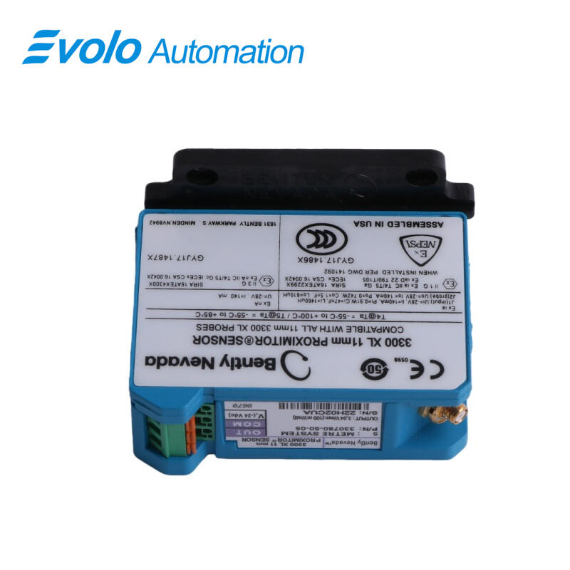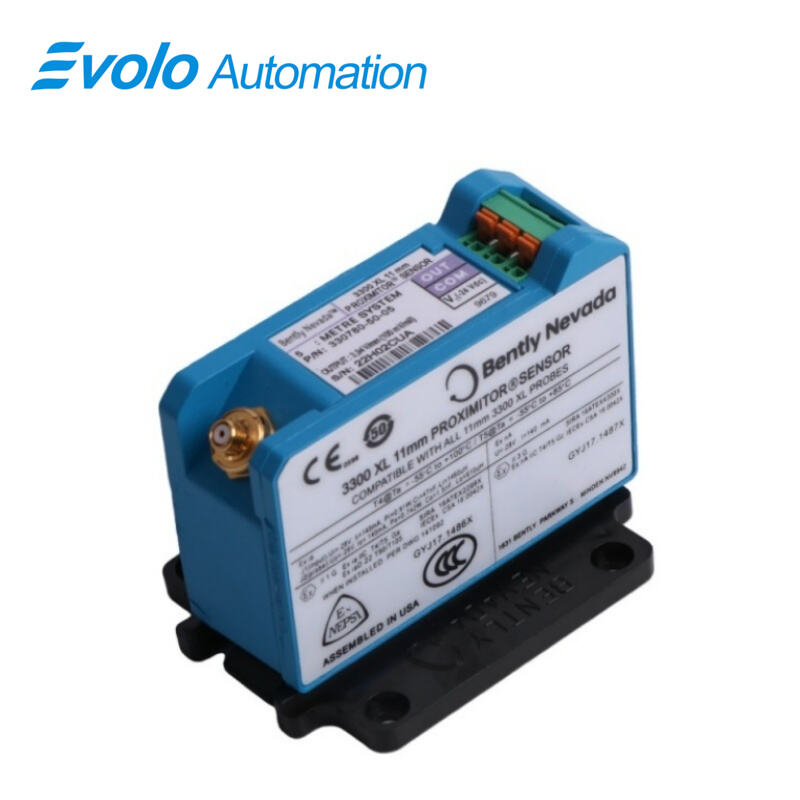 The 330780-50-05 3300 XL 11 mm Proximitor Sensor is a high-performance, non-contact vibration and displacement transducer system designed for industrial automation and rotating machinery monitoring. This sensor accepts one 3300 XL 11 mm Proximity Probe and Extension Cable, delivering a 3.94 V/mm (100 mV/mil) output for precise shaft position and vibration measurements on fluid film bearing machines. Constructed from durable A380 aluminum, the sensor supports panel mount installation and system lengths up to 5 meters (16.4 feet). It operates across extreme conditions, from -52°C to +100°C, with relative humidity up to 100% condensing, and maintains high signal integrity with less than 2 mV variation per volt of supply change. Enhanced RFI/EMI immunity allows CE mark compliance without special mounting, ensuring accurate measurements in high-frequency industrial environments. Features such as SpringLoc terminal strips simplify wiring, while patented TipLoc and CableLoc designs ensure robust probe-tip attachment and 330 N pull strength. Optional FluidLoc cables prevent fluid leakage, and connector protectors enhance environmental reliability. The 3300 XL 11 mm Proximitor Sensor fully replaces legacy 7200-series 11 mm and 14 mm transducers, providing seamless integration with 3300 and updated 3500 Monitoring Systems for advanced automated condition monitoring.