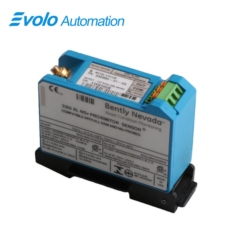 The 330980-51-05 3300 XL NSv Proximitor Sensor is designed for automated 3300 XL NSv Transducer Systems, accepting one 3300 NSv or 3300 RAM Proximity Probe with extension cable. With a 5.0-meter system length and DIN-rail mount, 330980-51-05 allows precise measurement of radial vibration and axial (thrust) position on small shafts or flat targets under tight installation constraints.