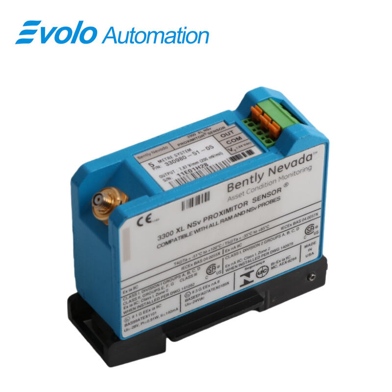 330980-51-05 3300 XL NSv Proximitor Sensor processes signals from 3300 NSv Proximity Probes over 5-meter extension cables, enabling precise radial vibration measurement on shafts smaller than 51 mm. Using its 1.5 mm linear range, 330980-51-05 provides high-resolution vibration data for centrifugal compressors, refrigeration compressors, and process gas compressors.
