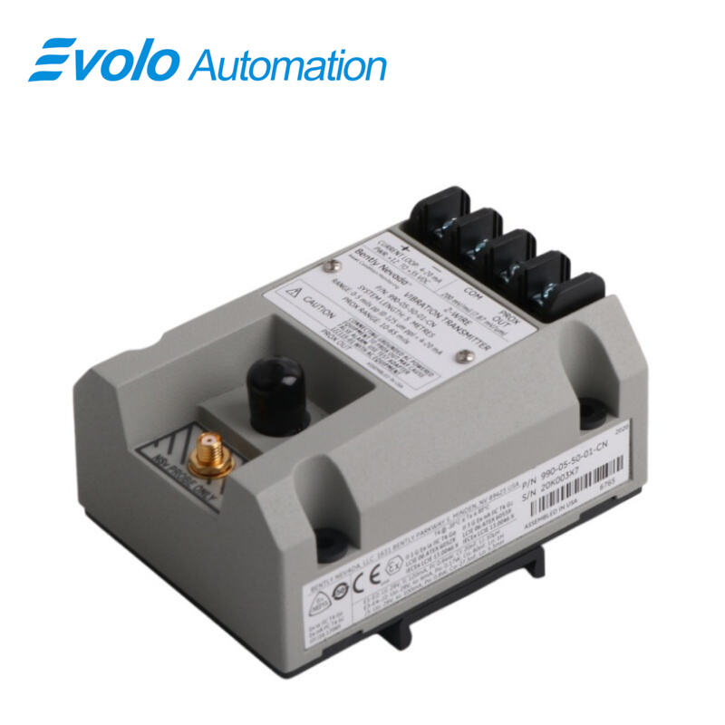 The 990-05-50-01-CN Vibration Transmitter converts input from a 3300 NSv Proximity Probe into a proportional 4–20 mA signal for automated machinery control. The 990-05-50-01-CN Vibration Transmitter operates over a linear range of 0.25–1.65 mm (10–65 mils) and supports system lengths up to 5.0 m (16.4 ft). Powered by +12 to +35 Vdc with 23 mA typical current, it delivers loop-powered signal conditioning for small pumps, motors, fans, or centrifugal compressors. The 990-05-50-01-CN Vibration Transmitter includes an integrated Proximitor Sensor, non-isolated Prox Out with 10 kΩ impedance, and BNC connector output for diagnostics. DIN-rail mounting and potted construction allow quick installation in high-humidity environments. The Not OK/Signal Defeat circuit prevents false alarms due to loose or damaged 3300 NSv Proximity Probes, while non-interacting zero and span potentiometers simplify loop adjustments. With CSA Division 2, ATEX Zone 0/2, and ABS maritime approvals, the 990-05-50-01-CN Vibration Transmitter meets industrial automation requirements in hazardous or marine environments.