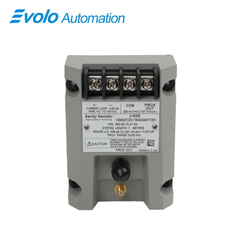 The 990-05-70-01-00 is a high-performance, loop-powered Vibration Transmitter from Bently Nevada, engineered to provide reliable, continuous monitoring of machinery health. This robust transmitter converts raw vibration signals from compatible proximity probes into a standardized 4-20 mA output signal, which is directly proportional to the measured vibration level. This seamless signal conversion enables easy integration with Distributed Control Systems (DCS), Programmable Logic Controllers (PLC), and other plant-wide monitoring networks, facilitating real-time equipment protection and predictive maintenance strategies. Designed for simplicity and durability, this industrial vibration transmitter is an ideal solution for monitoring critical assets such as pumps, motors, fans, and compressors where continuous vibration data is essential for operational safety and efficiency.