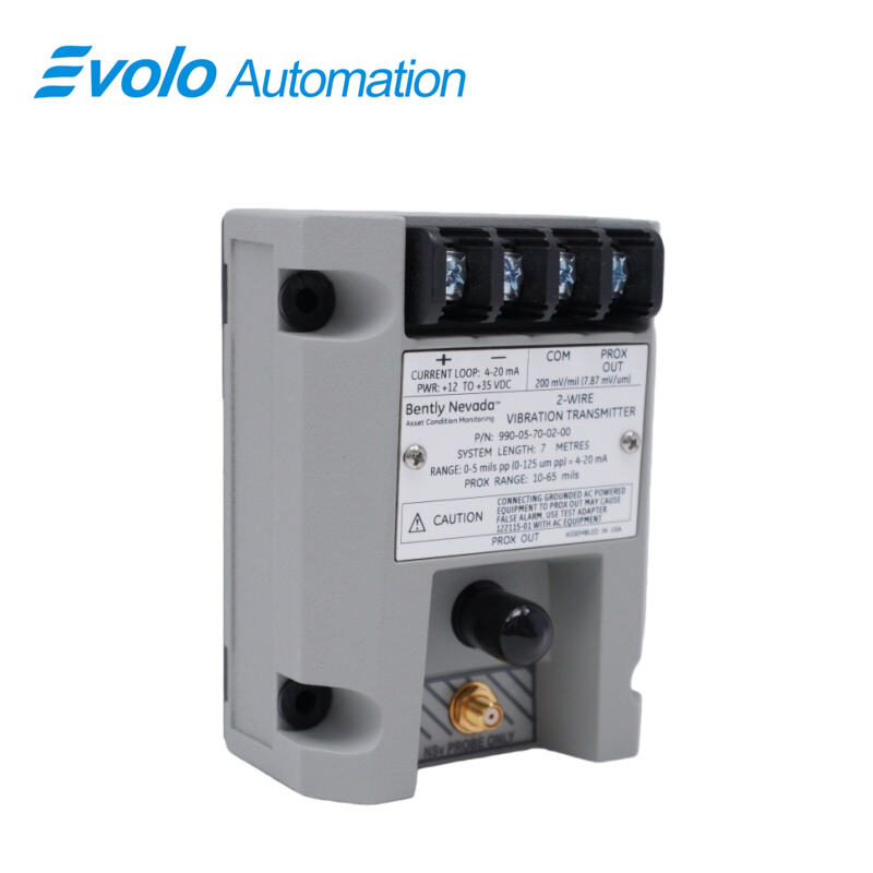 The 990-05-70-02-00 Vibration Transmitter is a compact, loop-powered vibration monitoring device designed for industrial automation systems that require reliable real-time machinery condition feedback. Engineered to work directly with a 3300 NSv non-contacting proximity probe and matching extension cable, this vibration transmitter converts dynamic shaft vibration into a standardized 4 to 20 mA output signal for direct integration with PLCs, DCS platforms, and machinery control systems.