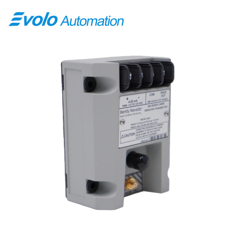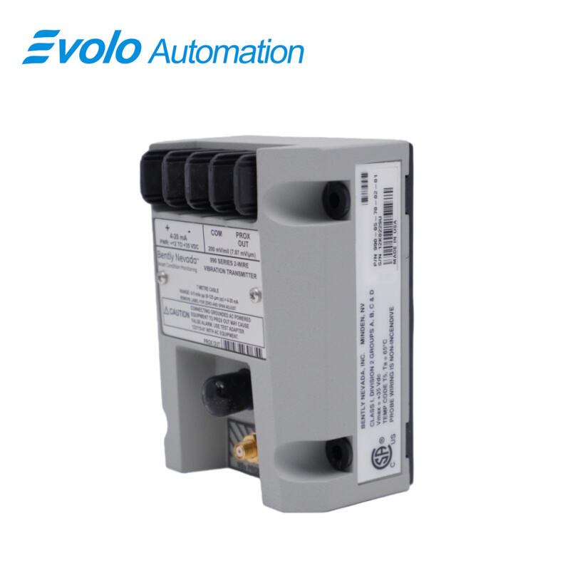 The 990-05-70-02-01 Vibration Transmitter is a high-precision, loop-powered device designed for industrial automation systems to provide real-time vibration monitoring of rotating machinery. Engineered for OEM integration with centrifugal air compressors, small pumps, motors, and fans, this transmitter converts signals from a 3300 NSv Proximity Probe into a 4–20 mA industry-standard output, representing peak-to-peak vibration amplitude in millimeters or mils. It supports linear ranges from 0.25 to 1.65 mm (10–65 mils) and full-scale vibration measurements up to 5 mils pp (125 μm pp). The transmitter operates reliably in harsh conditions with an operating temperature range of -35°C to +85°C (-31°F to +185°F) and storage temperatures from -52°C to +100°C (-62°F to +212°F). With CSA Division 2 approval, the transmitter is suitable for hazardous locations. Features include integrated Proximitor Sensor, non-isolated PROX OUT and COM terminals with BNC output for diagnostic purposes, non-interacting zero and span potentiometers for precise loop adjustment, and a Not OK/Signal Defeat circuit to prevent false alarms from faulty probes or loose connections. Mounting is simplified via bulkhead screws or optional DIN-rail clips, and potted construction ensures reliable performance in 100% condensing humidity environments. With a 7-meter system cable option, the 990 Transmitter enables flexible installation in tight machinery spaces while maintaining high-fidelity vibration data for automation control and machinery protection.