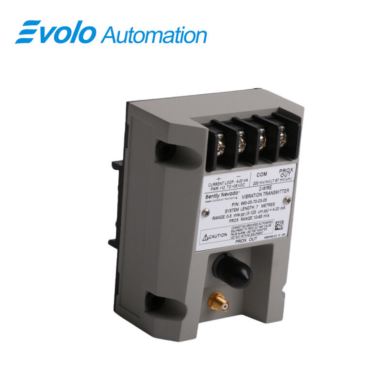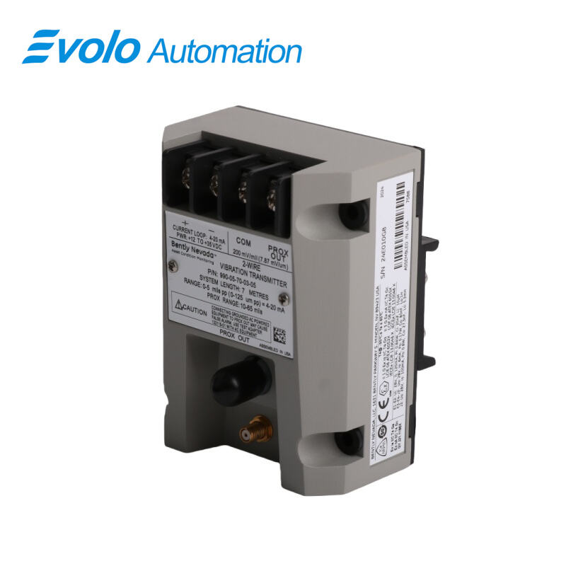 The 990-05-70-03-00 Vibration Transmitter is a precision, loop-powered industrial vibration monitoring device designed for automated machinery protection systems. Compatible with a single 3300 NSv Proximity Probe and extension cable, this transmitter converts non-contacting displacement measurements into a 4 to 20 mA proportional vibration signal, providing real-time input for control and safety logic in industrial automation. Its compact design (9.8 x 7.3 x 5.8 cm, 0.5 kg) and versatile mounting options using DIN clips or screws make it suitable for centrifugal air compressors, small pumps, motors, and fans where installation space is limited. The transmitter operates across -35°C to +85°C, with storage up to -52°C to +100°C, and supports a full-scale vibration range of 0–5 mils peak-to-peak (0–125 μm) with linear Prox Out from 0.25 to 1.65 mm (10–65 mils). Non-interacting zero and span potentiometers allow easy loop adjustment, while integrated Proximitor circuitry eliminates the need for external signal conditioning units. Additional features include coaxial diagnostic output, Not OK/Signal Defeat circuit for false alarm prevention, and potted construction for 100% condensing humidity resistance. The 990 Vibration Transmitter is ideal for OEMs seeking a compact, reliable, and precise vibration input for automated control systems.