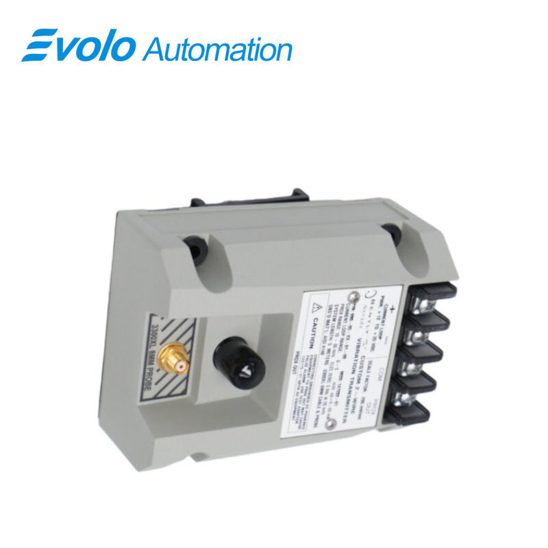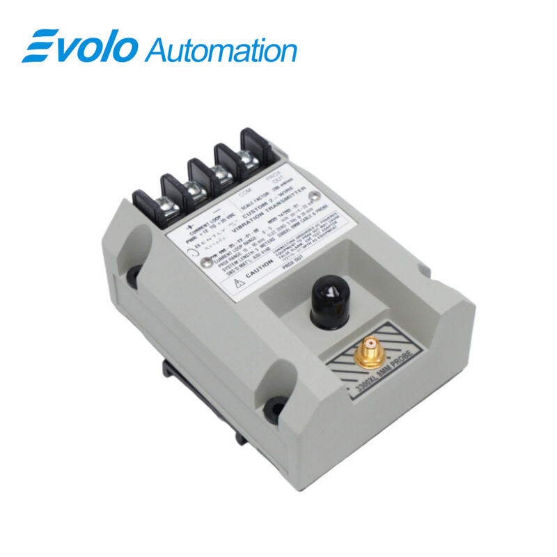 The 990-05-XX-03-01 MOD:168251-01 Vibration Transmitter is a precision two-wire, loop-powered device designed for industrial automation and machinery protection systems. Engineered for OEM applications in centrifugal air compressors, small pumps, motors, and fans, it converts input from a 3300 NSv proximity probe and extension cable into a 4–20 mA proportional vibration signal. Supporting full-scale vibration measurements from 0 to 5 mils pp (0–125 μm pp) and system lengths up to 7 meters (23 feet), the transmitter provides reliable vibration amplitude readings for control and monitoring systems. Operating over a temperature range of -35°C to +85°C (-31°F to +185°F) and CSA Division 2 certified, it is suitable for challenging industrial environments. Features include integrated Proximitor sensor technology requiring no external modules, non-interacting zero and span potentiometers for easy loop adjustment, test input for rapid signal verification, and a Not OK/Signal Defeat circuit to prevent false alarms. DIN-rail clips or bulkhead screws simplify installation, while potted construction ensures humidity resistance up to 100% condensing. This transmitter delivers robust, accurate, and compact vibration measurement solutions for modern industrial automation.