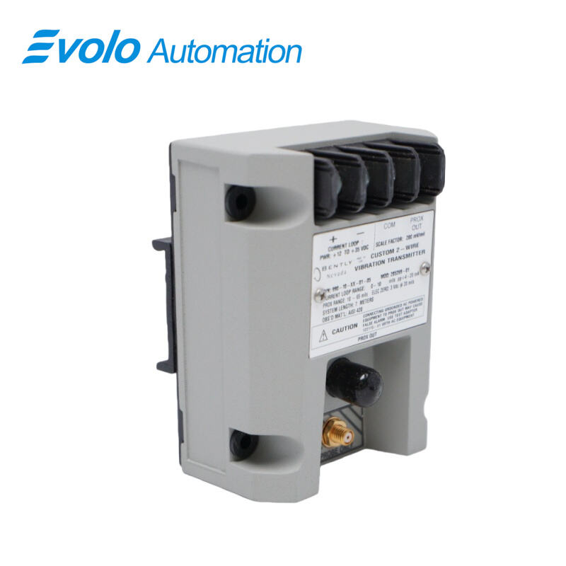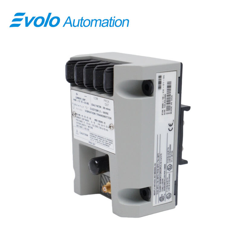 The 990-10-XX-01-05 MOD:165353-07 Vibration Transmitter is a robust, loop-powered, two-wire device designed for industrial automation and machinery protection applications. Specifically engineered for centrifugal air compressors, small pumps, motors, and fans, this transmitter converts input from a 3300 NSv Proximity Probe into a proportional 4 to 20 mA signal that accurately represents vibration amplitude in peak-to-peak engineering units. The transmitter features full-scale options up to 0–10 mils (0–250 μm pp), supports system lengths of 5.0 meters, and operates reliably across a wide temperature range of -35°C to +85°C (-31°F to +185°F), with storage temperatures down to -52°C (-62°F). It is fully compatible with 3300 NSv probes, allowing installation in compact spaces typical of industrial machines. The integrated Proximitor Sensor eliminates the need for an external unit, while features like non-isolated PROX OUT terminals, test input pin, and Not OK/Signal Defeat circuit ensure diagnostic capability and prevent false alarms. Approved for CSA Division 2, ATEX Zone 0/2, and ABS maritime applications, the transmitter provides reliable performance in hazardous and high-humidity environments, meeting the rigorous demands of modern automated industrial systems.