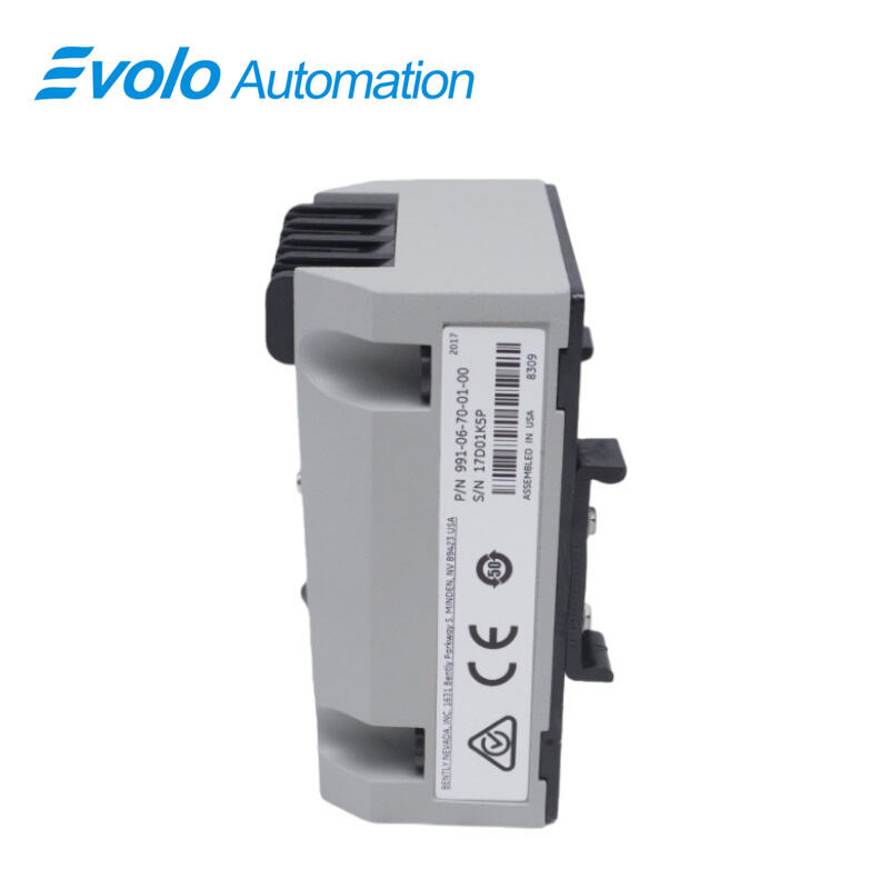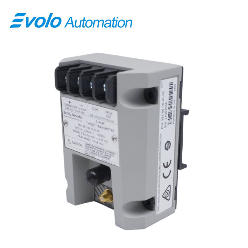 The 991-06-70-01-00 Thrust Transmitter is a 2-wire, loop-powered device designed for OEMs of centrifugal air compressors, small pumps, motors, and fans. It accepts input from a 3300 NSv Proximity Probe and extension cable (5 m or 7 m) and converts axial shaft displacement into a 4–20 mA signal for automated machinery control. The 991-06-70-01-00 features a linear range of 0.25–1.65 mm (10–65 mils), full-scale option of 0.6–0–0.6 mm, and a maximum loop resistance of 1000 Ω at 35 Vdc. The transmitter operates in temperatures from -35°C to +85°C and supports DIN-rail mounting with 35 mm clips.