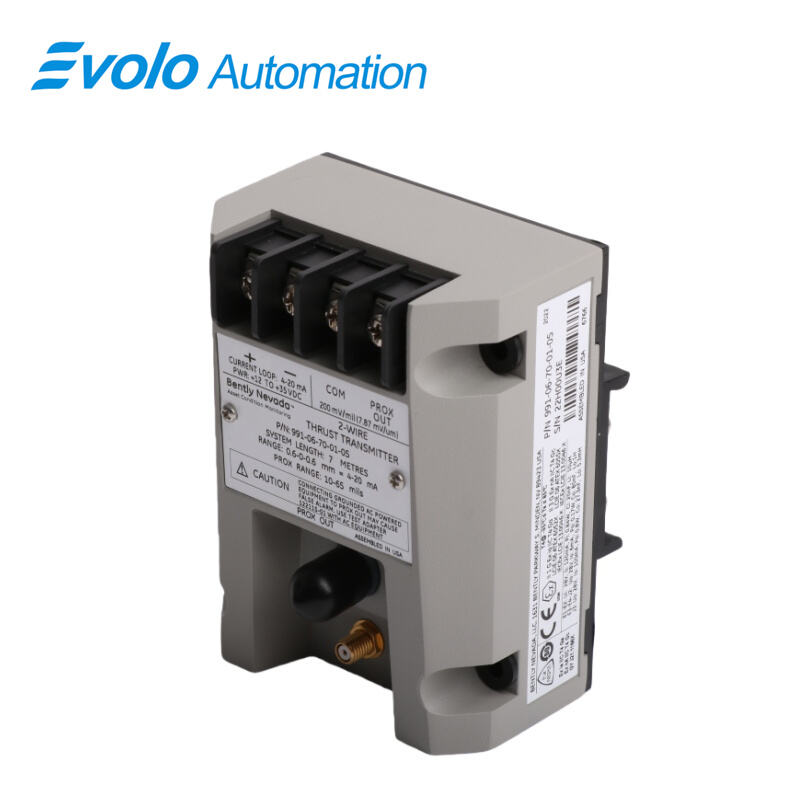 The 991-06-70-02-01 Thrust Transmitter converts input from a 3300 NSv Proximity Probe into a 4–20 mA signal for monitoring axial shaft movement within a linear range of 0.25–1.65 mm (10–65 mils), supporting automated machinery control in centrifugal compressors, small pumps, and motors.