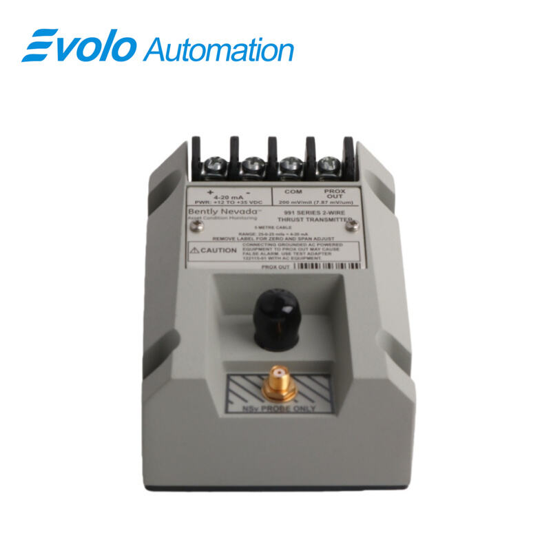 Connect the 991-25-50-02-05 Thrust Transmitter to a 3300 NSv Proximity Probe on compressor shafts. The transmitter converts shaft displacement into a 4 to 20 mA signal for automated monitoring and control.